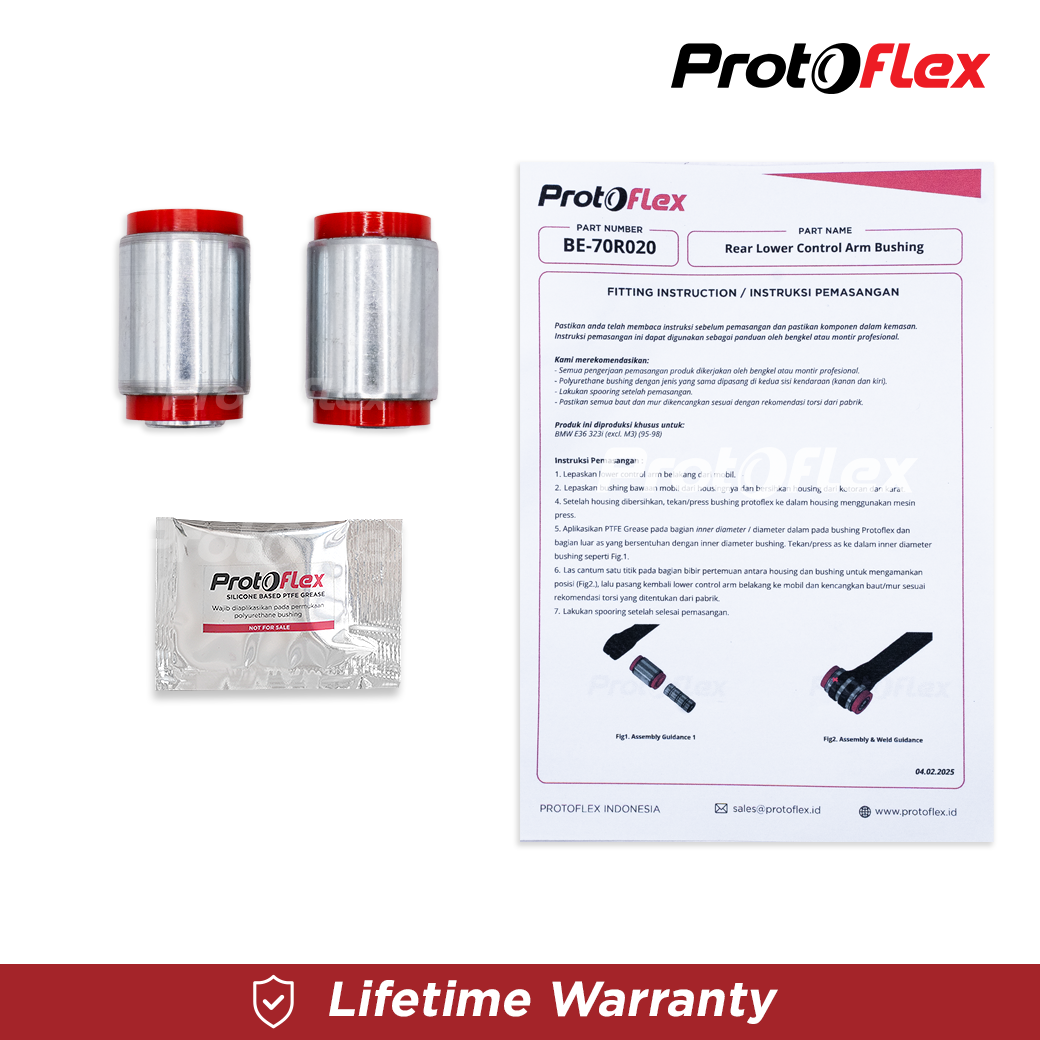 Bushing Protoflex memiliki performa dan kualitas melebihi part OEM original pabrik dan memiliki ketahanan terhadap suhu, air, kimia dan cuaca sehingga dapat bertahan seumur hidup mobil.