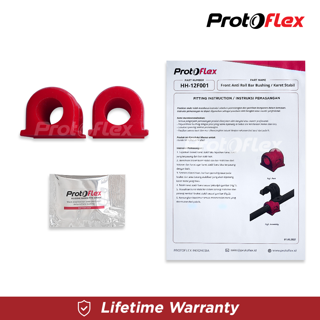 Bushing Protoflex memiliki performa dan kualitas melebihi part OEM original pabrik dan memiliki ketahanan terhadap suhu, air, kimia dan cuaca sehingga dapat bertahan seumur hidup mobil.