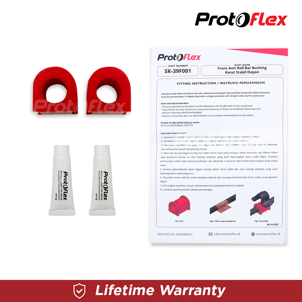 Bushing Protoflex memiliki performa dan kualitas melebihi part OEM original pabrik dan memiliki ketahanan terhadap suhu, air, kimia dan cuaca sehingga dapat bertahan seumur hidup mobil.