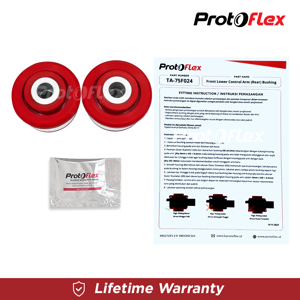 Bushing Protoflex memiliki performa dan kualitas melebihi part OEM original pabrik dan memiliki ketahanan terhadap suhu, air, kimia dan cuaca sehingga dapat bertahan seumur hidup mobil.