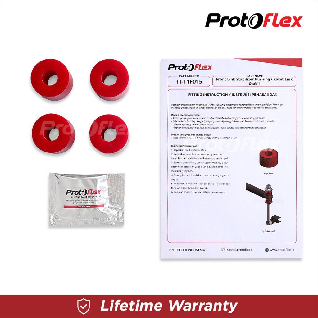 Bushing Protoflex memiliki performa dan kualitas melebihi part OEM original pabrik dan memiliki ketahanan terhadap suhu, air, kimia dan cuaca sehingga dapat bertahan seumur hidup mobil.