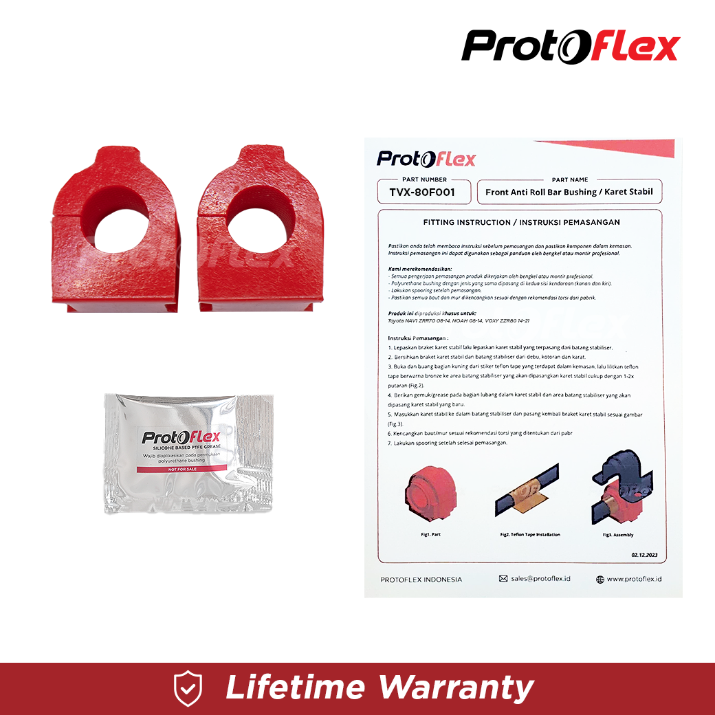 Bushing Protoflex memiliki performa dan kualitas melebihi part OEM original pabrik dan memiliki ketahanan terhadap suhu, air, kimia dan cuaca sehingga dapat bertahan seumur hidup mobil.