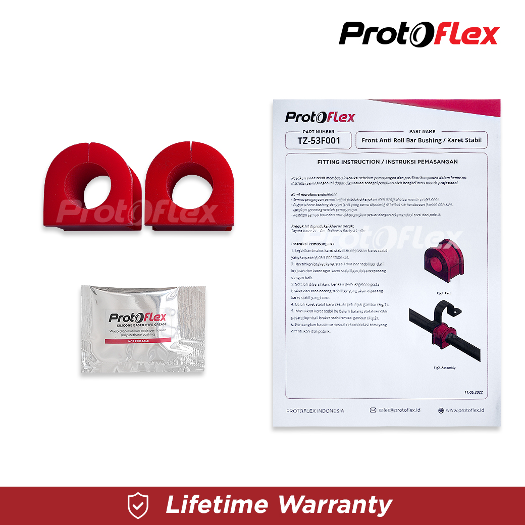Bushing Protoflex memiliki performa dan kualitas melebihi part OEM original pabrik dan memiliki ketahanan terhadap suhu, air, kimia dan cuaca sehingga dapat bertahan seumur hidup mobil.