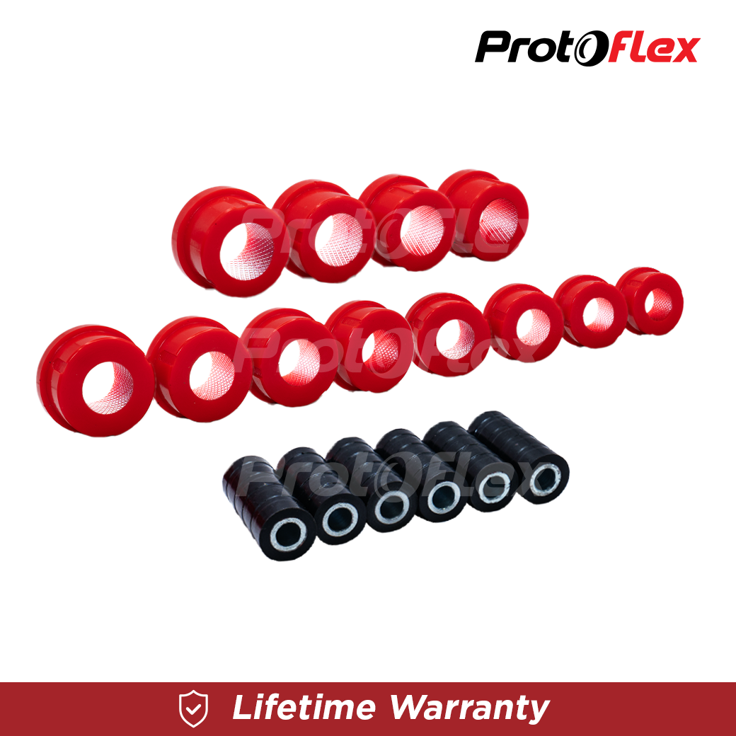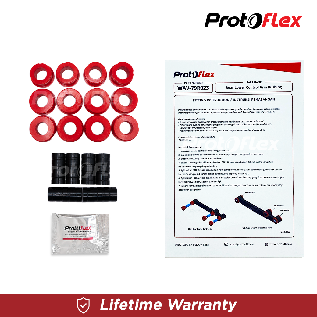 Bushing Protoflex memiliki performa dan kualitas melebihi part OEM original pabrik dan memiliki ketahanan terhadap suhu, air, kimia dan cuaca sehingga dapat bertahan seumur hidup mobil.