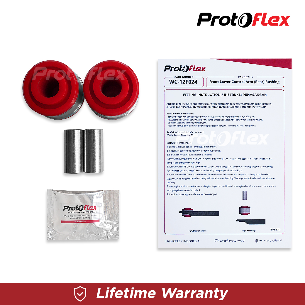 Bushing Protoflex memiliki performa dan kualitas melebihi part OEM original pabrik dan memiliki ketahanan terhadap suhu, air, kimia dan cuaca sehingga dapat bertahan seumur hidup mobil.