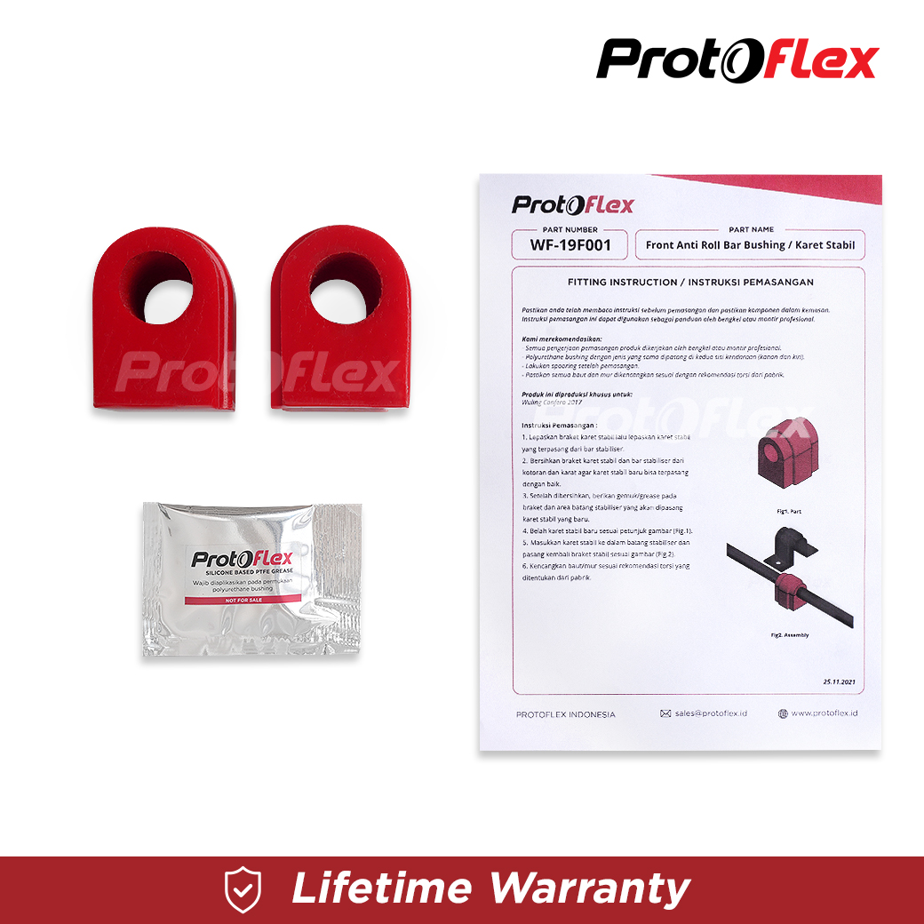 Bushing Protoflex memiliki performa dan kualitas melebihi part OEM original pabrik dan memiliki ketahanan terhadap suhu, air, kimia dan cuaca sehingga dapat bertahan seumur hidup mobil.